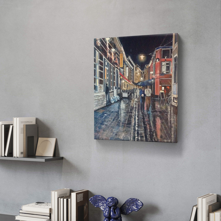 In Muntstraat by Night vangt Willy Cop de poëzie van een regenachtige avond in de stad. De natte klinkers weerspiegelen het warme licht van cafés en lantaarns, terwijl twee figuren onder één paraplu door de straat wandelen. Hun silhouetten, de glans van het plaveisel en de zachte nevel van de nacht roepen een sfeer van rust en melancholische schoonheid op. De verfstreken en het subtiele kleurenspel geven de indruk van een vluchtig moment dat zich voor altijd in het geheugen nestelt.